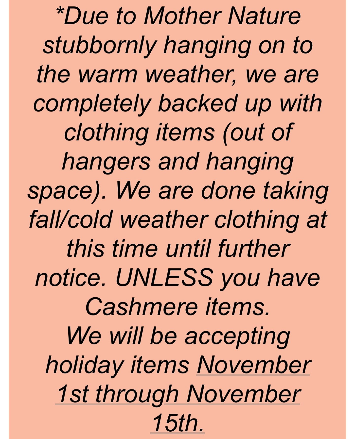 15 seasonal clothing items brought in on hangers (wrinkle free is the goal)